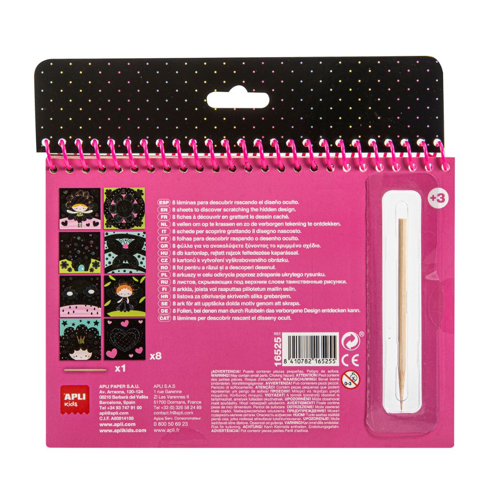 Fairies Magic Scratch Pad este un caiet creativ cu tematică de zâne, care conține 8 foi de zgâriat și un bețișor din lemn pentru gravură. Copiii trebuie doar să zgârie suprafața neagră a desenului pentru a dezvălui culorile ascunse dedesubt.