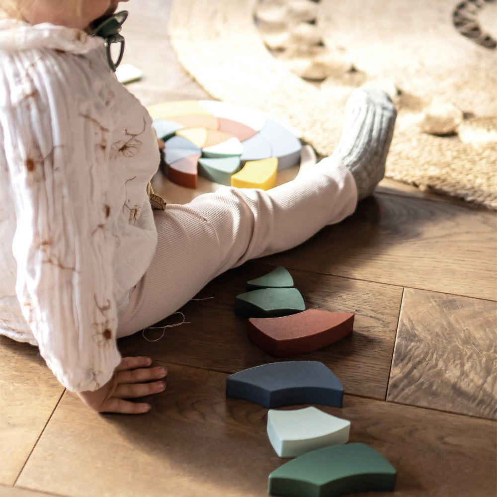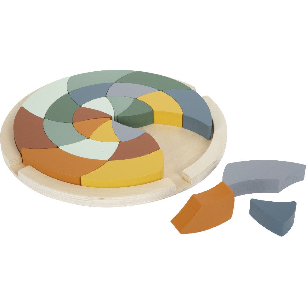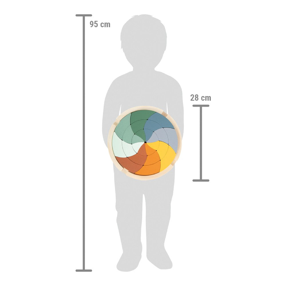 Când sunt asamblate, piesele din puzzle-ul multifuncțional formează un design frumos de mandală. Cu toate acestea, ele pot fi, de asemenea, scoase din placa circulară de lemn și utilizate ca blocuri de construcție din lemn, pentru jocurile de stivuire și pentru jocurile de construcție imaginativă.