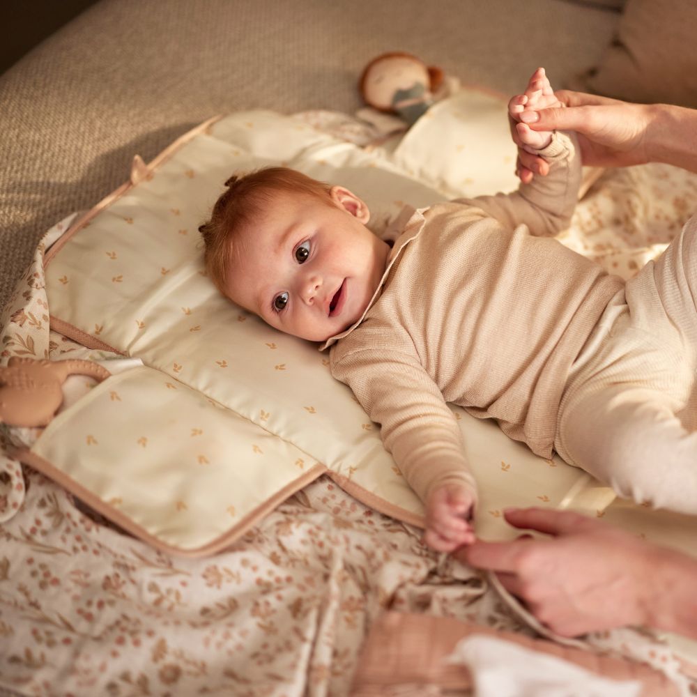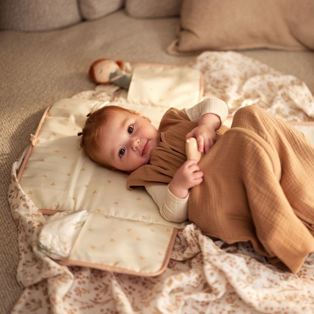 Salteaua de înfășat portabilă din muselină este partenerul ideal pentru părinții activi. Aceasta include un spațiu practic pentru scutece, astfel încât să ai cele necesare mereu la îndemână în timpul schimbării bebelușului.
